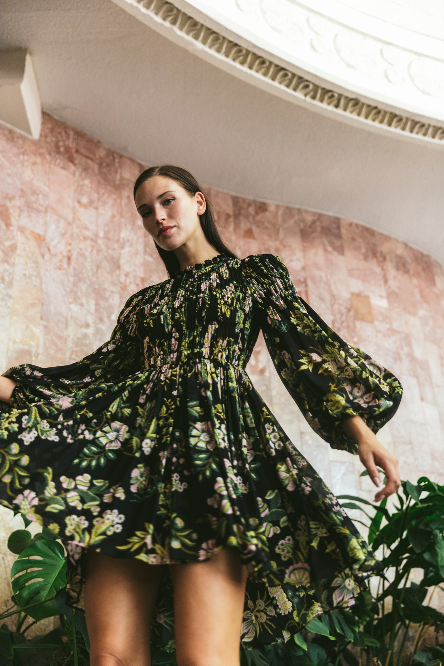 • Leaf-hugging smocking at the sleeve releases into blouson sleeves
