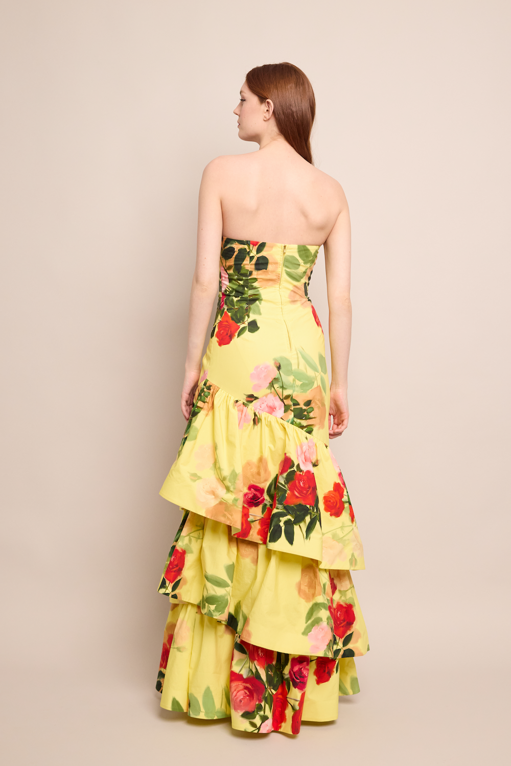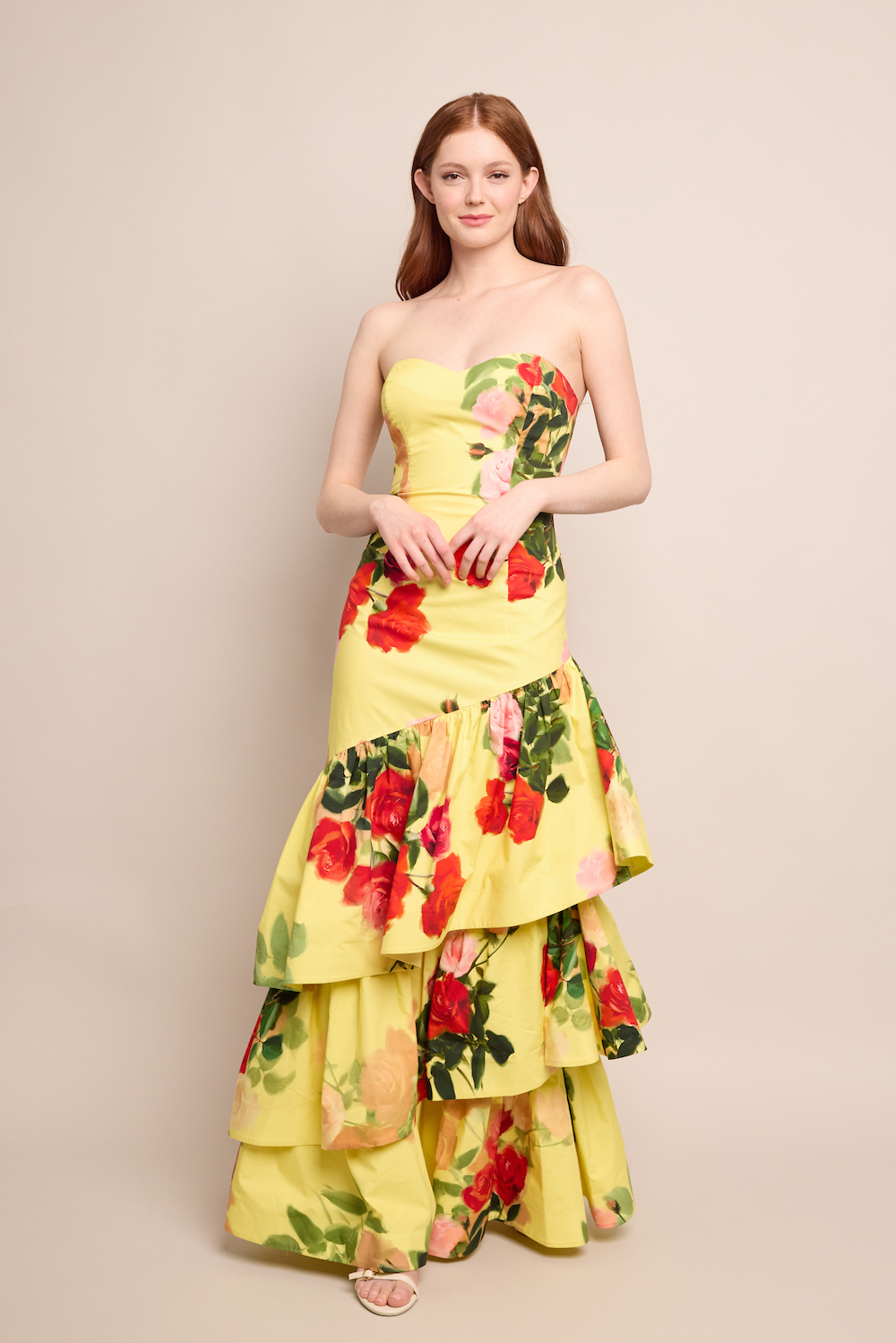 • Strapless tiered maxi dress with sweetheart neckline and asymmetrical ruffle tiers at hem